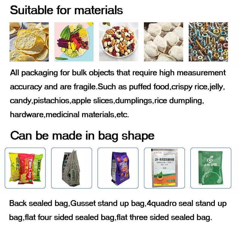 Вертикальные упаковочные машины могут упаковывать порошки, гранулы, закуски, крупы, детали оборудования и небольшие промышленные компоненты.